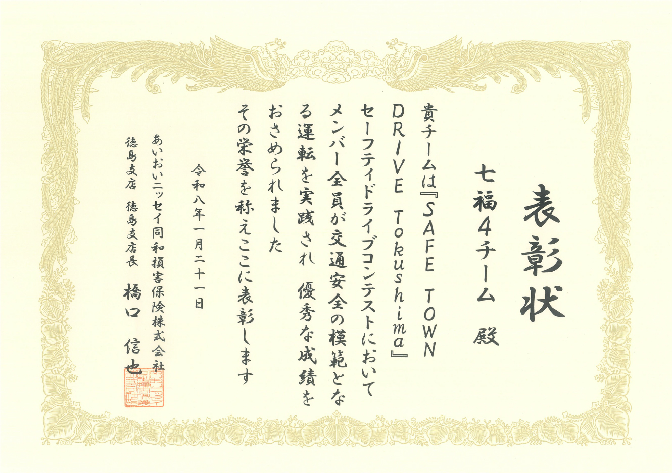 あいおいニッセイ同和損害保険徳島支店が主催する、車の安全運転の得点を競うセーフティドライブコンテストで、弊社の「七福4チーム」が上位5位に入賞しました。